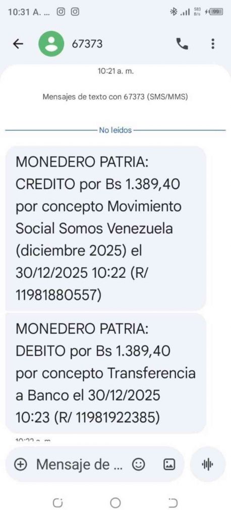 El beneficio corresponde al Movimiento Social Somos Venezuela, uno de los programas sociales vinculados al Sistema Patria. El monto asignado es de Bs 1.389,40, acreditado directamente en el monedero digital de cada beneficiario.